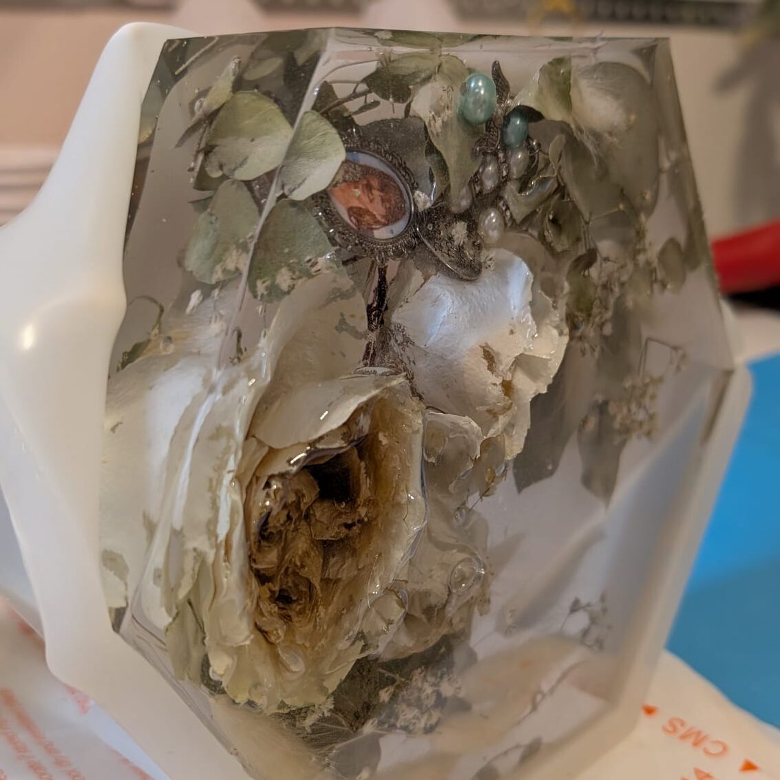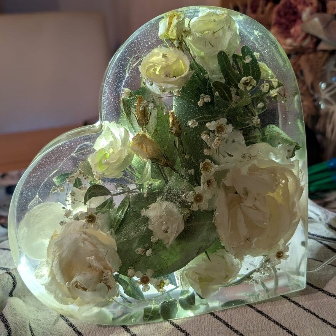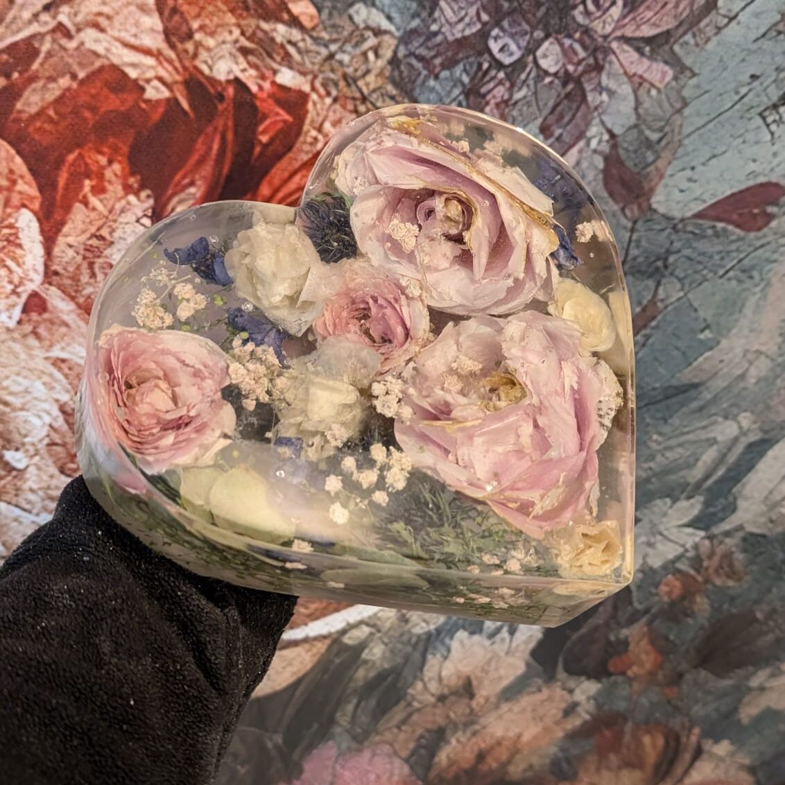 Neben großen (beleuchteten) Kugeln, Herzen, Sechsecken und Halbkreisen besteht auch die Möglichkeit, kleinere Deko oder Gegenstände wie z.B. Weinkorken und Teelichthalter aus den Blüten des Brautstraußes zu gießen. Auch können z.B. aus einzelnen Blüten und Blättern Schmuckstücke wie Kettenanhänger, Charms oder Ringe gefertigt werden.